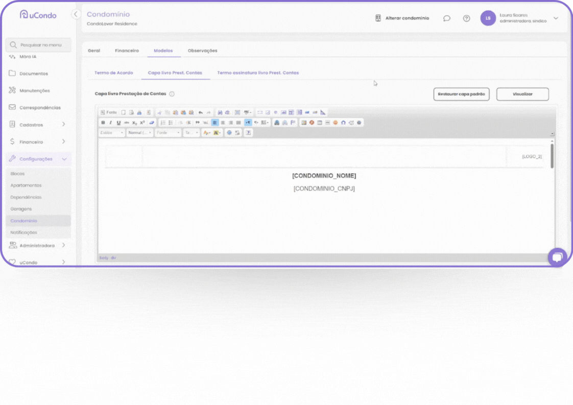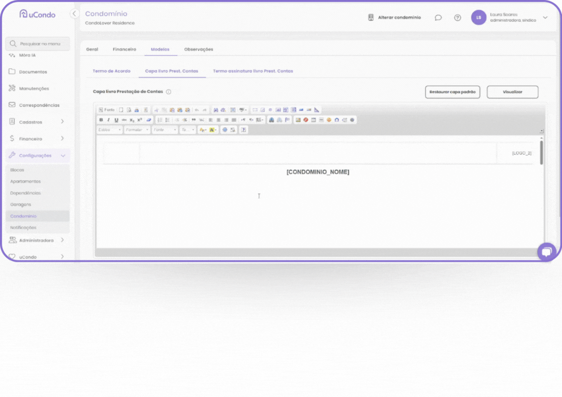 A personalização da capa e do termo de assinatura do livro de prestação de contas é uma funcionalidade essencial para garantir que os documentos financeiros do seu condomínio reflitam sua identidade visual e atendam às exigências legais. Com essa ferramenta, você pode ajustar os modelos padrão de forma simples e prática, proporcionando uma apresentação profissional e alinhada com as normas do condomínio.